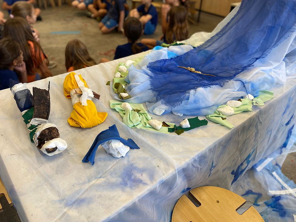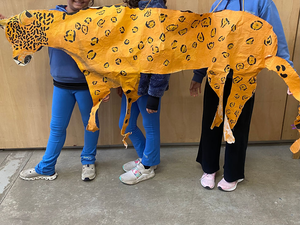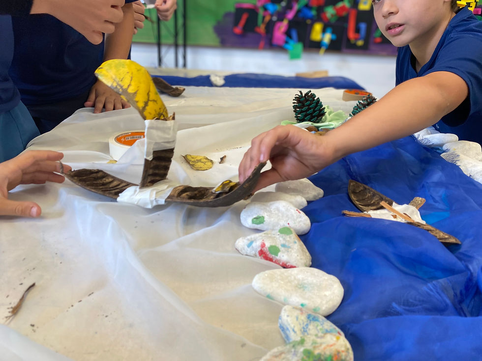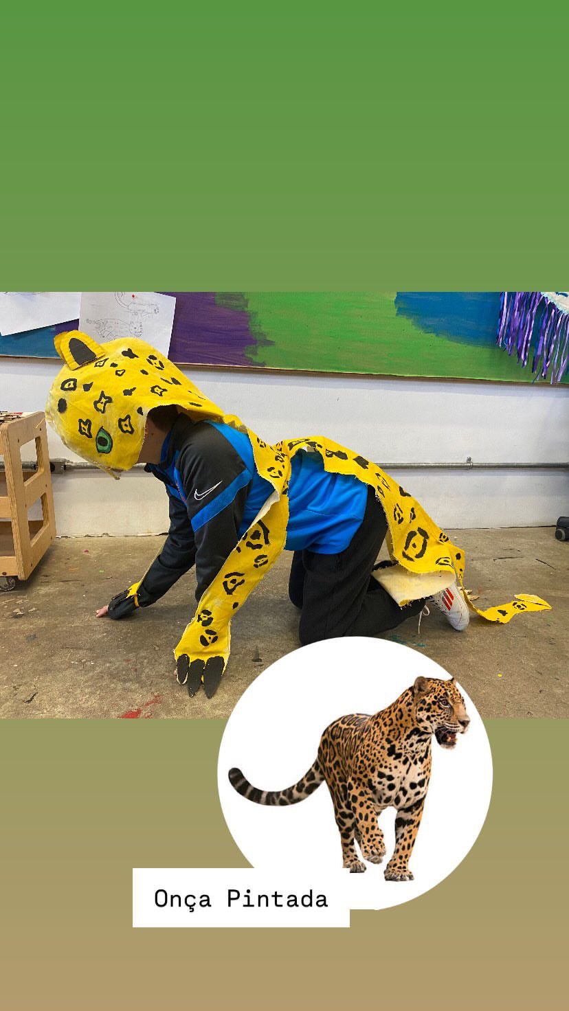 Pesquisa sobre o caminhos dos rios e suas margens. Os estudantes do 4° ano tiveram a oportunidade de criar paisagens ribeirinhas com materiais não estruturados como tecidos, pedras cascalhos e folhas. A partir do livro "Tapajós" de Fernando Villela, começaram a investigar a fauna amazônica e, como fruto da pesquisa, criaram fantasias inspiradas nestes animais, feitas com tecido tinta e costura.