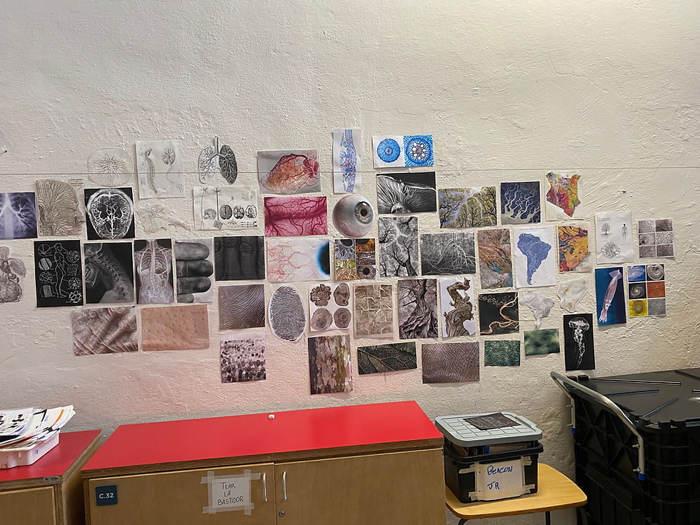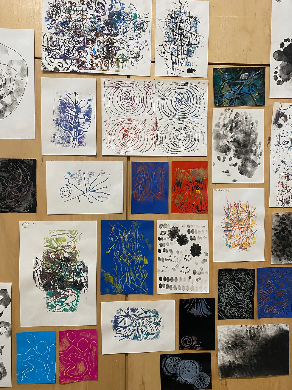 Nas aulas de Artes, integradas à unidade de investigação “Vida” (Life) do Programa IB, os alunos do 4° ano do ensino fundamental I, da Beacon School, exploraram as técnicas de carimbo e gravura a partir da observação de padrões visuais presentes no corpo humano e na natureza. Ao investigar semelhanças entre veios da madeira, impressões digitais, veias, mapas e sistemas do corpo, as crianças criaram composições utilizando marcas do próprio corpo e carimbos de barbante, desenvolvendo uma pesquisa visual que conecta arte, ciência e investigação.